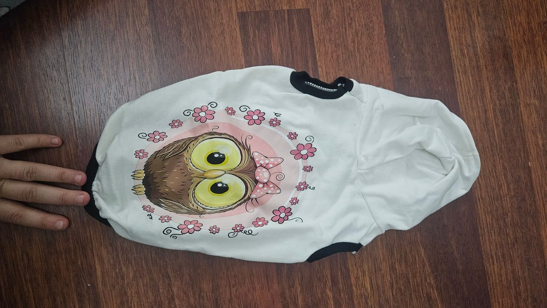 Kedi kıyafeti, renkli baskılı baykuş ve pembe çiçek desenleriyle, siyah yakalık ve bacak detaylarına sahiptir. L bedendir