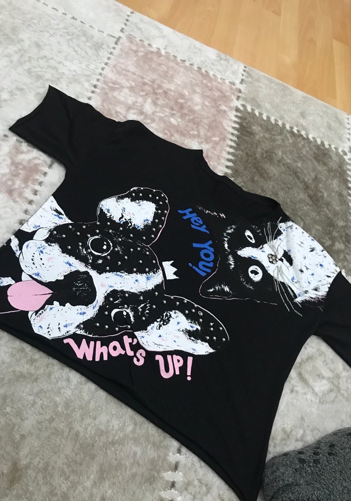 Siyah renkte, renkli baskılı kedi ve köpek figürleriyle sokak stili tişört. Canlı baskılar günlük kullanıma eğlenceli bir dokunuş katıyor.