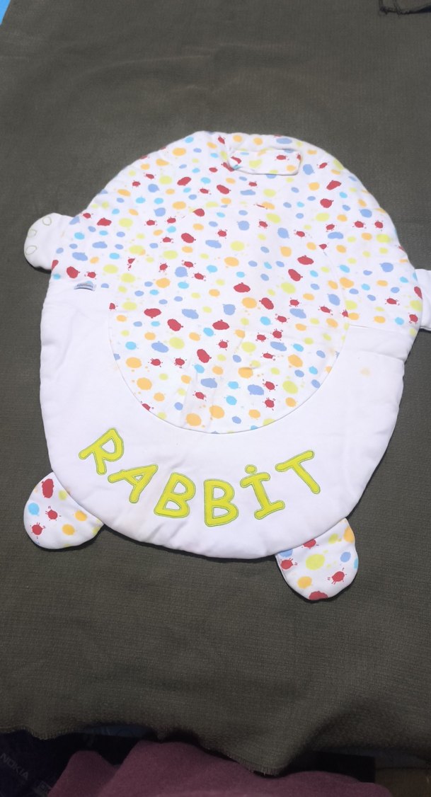 Renkli baskılı tavşan deseniyle çocuklar için yumuşak ve sıcak kumaştan üretilmiş uyku minderi. Resimde görüldüğü gibi ufacık 1. 2 leke var büyük ihtimalle çıkar.