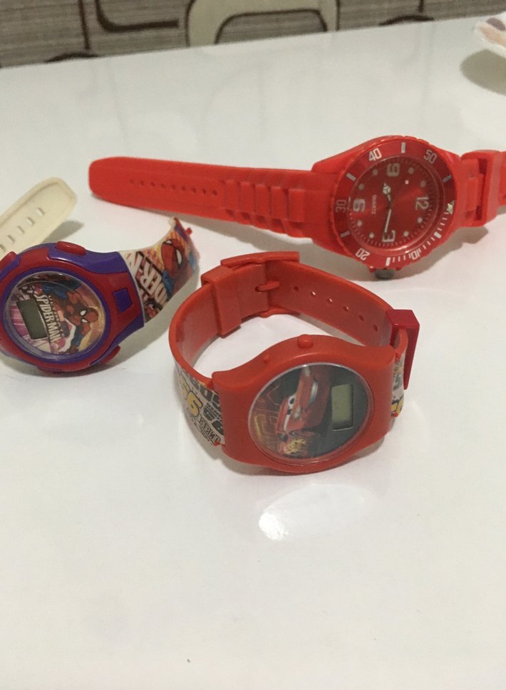 Plastik malzemeden yapılmış, tokalı ve baskılı desenlere sahip renkli erkek çocuk saatleri. Kırmızı ve çok renkli seçenekler mevcuttur. ⌚hepsi 250 TL