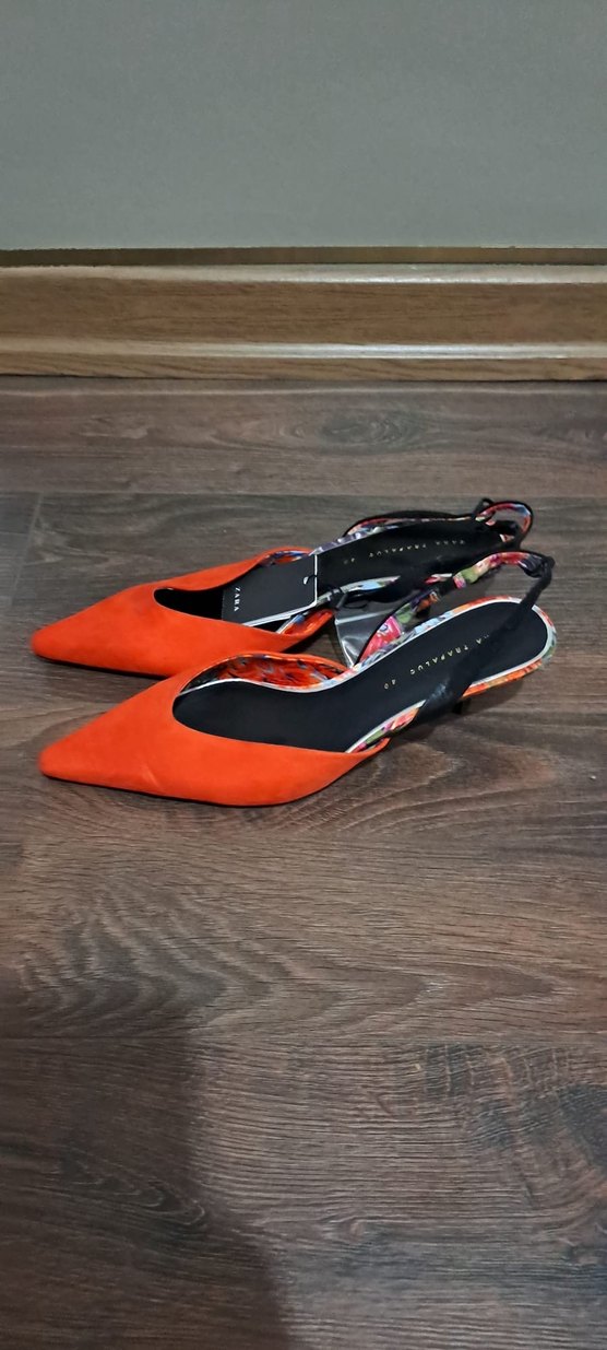 Kadın stiletto ayakkabılar, renkli baskılı desen, tokalı kayış ve kauçuk taban ile. İnce topuklu ve günlük kullanıma uygun modern tarzda.