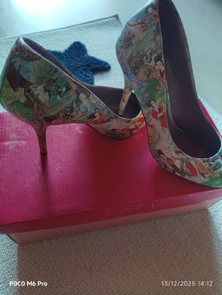 Renkli baskılı, tokalı yüksek topuklu stiletto ayakkabılar, kauçuk malzemeden üretilmiş, parti için avant-garde tarzda.