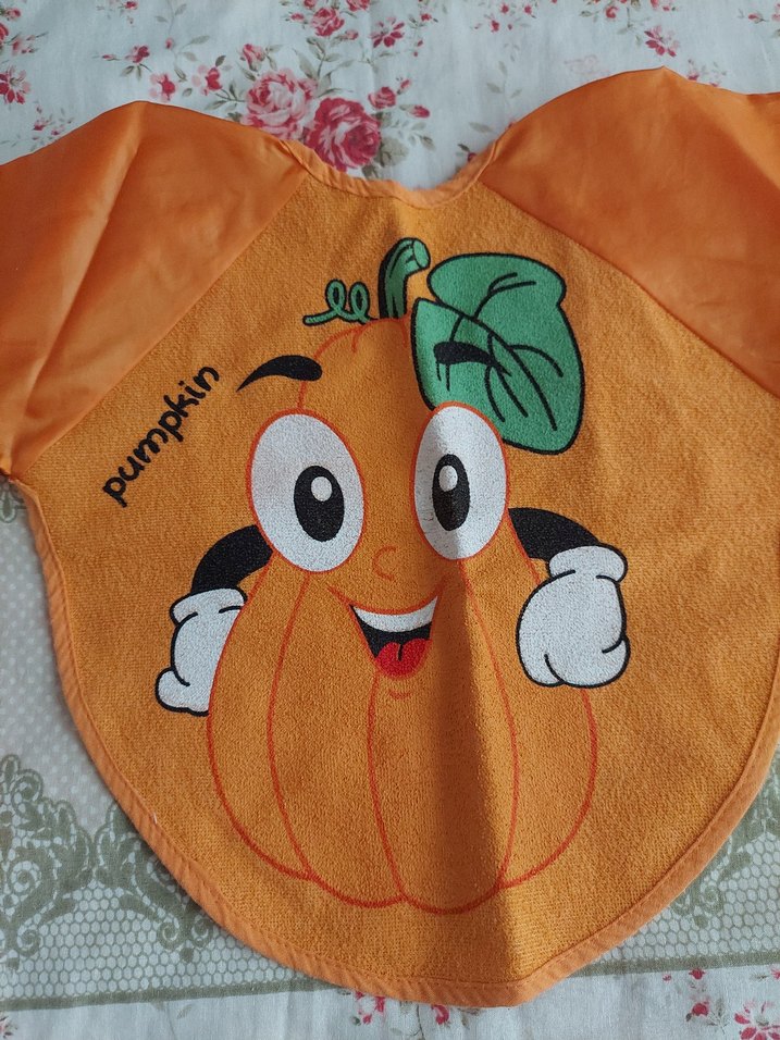 Turuncu renkli, baskılı balkabağı desenli bebek önlüğü. Yumuşak ve emici kumaştan yapılmıştır.