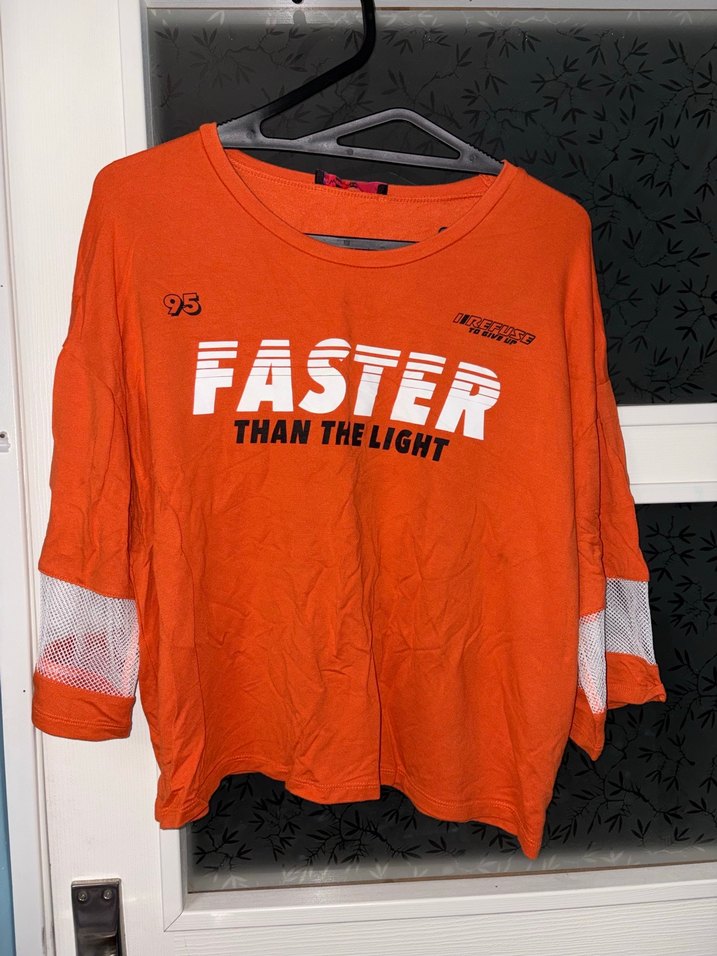 Turuncu renkli kısa kollu tişört, bol kesim ve pile detaylara sahiptir. Yuvarlak yaka ve "95, FASTER THAN THE LIGHT" yazılı baskı vardır. Sentetik kumaştan üretilmiştir.