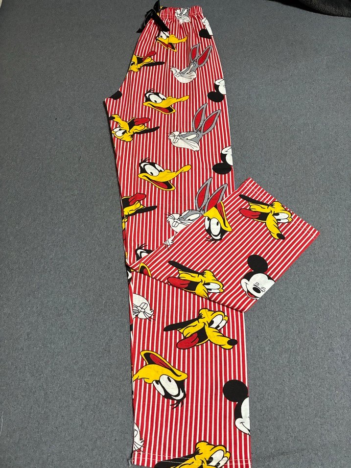 Renkli baskılı ünisex pijama altı, pile detaylı ve regular fit. Kırmızı çizgili zeminde popüler çizgi film karakterleri yer alır, şık ve rahat bir tarz sunar.