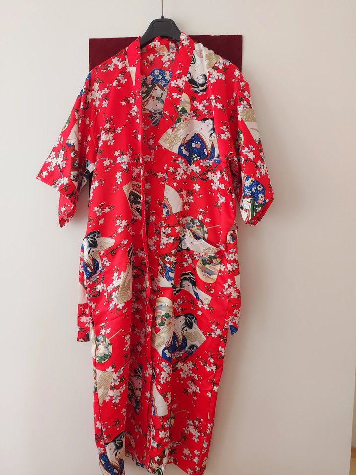 Renkli baskılı, uzun ve bol kesim kadın kimono. Yumuşak sentetik kumaştan, drapeli uzun kollu ve straplez yakalı, bohem tarzına uygun.Her bedene uygundur