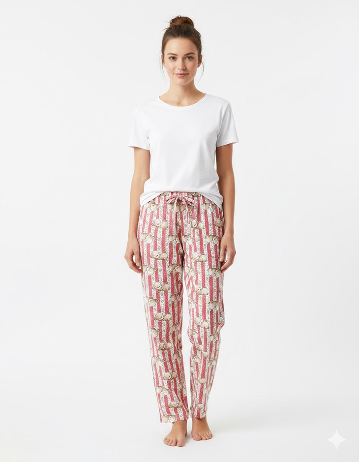 Renkli ve baskılı ayıcık desenli, uzun ve rahat kesim kadın pijama altı. Belinde bağcıklı, konforlu ve normcore tarzda.