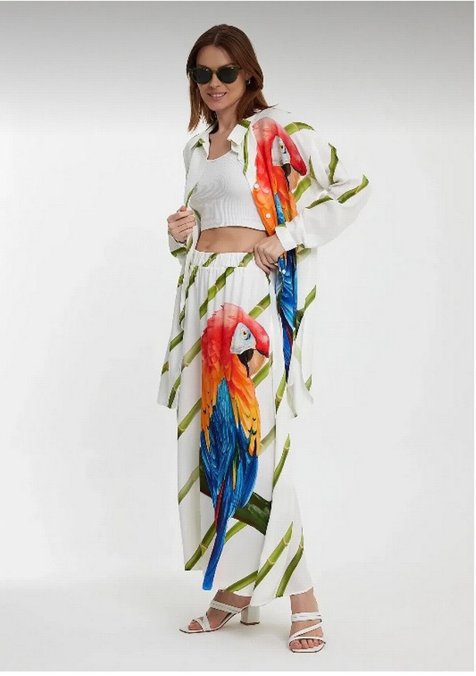Bol kesim, uzun kollu kadın sabahlık; bohem tarzda, renkli papağan baskısı ile. Hafif ve akışkan kumaş rahatlık sağlar. Ayrıca süpriz takı hediyemiz var
