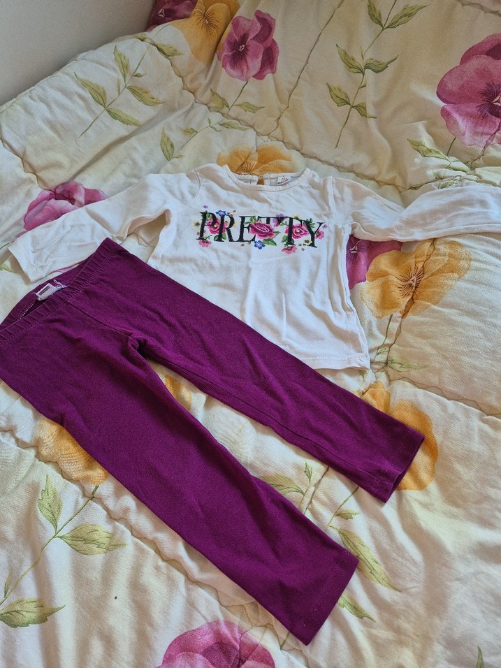 Renkli baskılı "PRESTY" yazılı uzun kollu beyaz üst ve mor örme pantolondan oluşan bebek kız takımı.