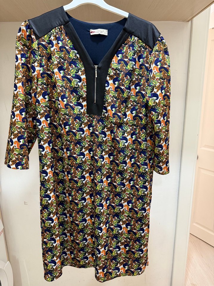 Renkli baskılı, uzun kollu ve bol kesim elbise. V yaka ve ön fermuar detaylı, siyah omuz panelleriyle hareketlendirilmiş. Yumuşak sentetik kumaştan, bohem tarzda.