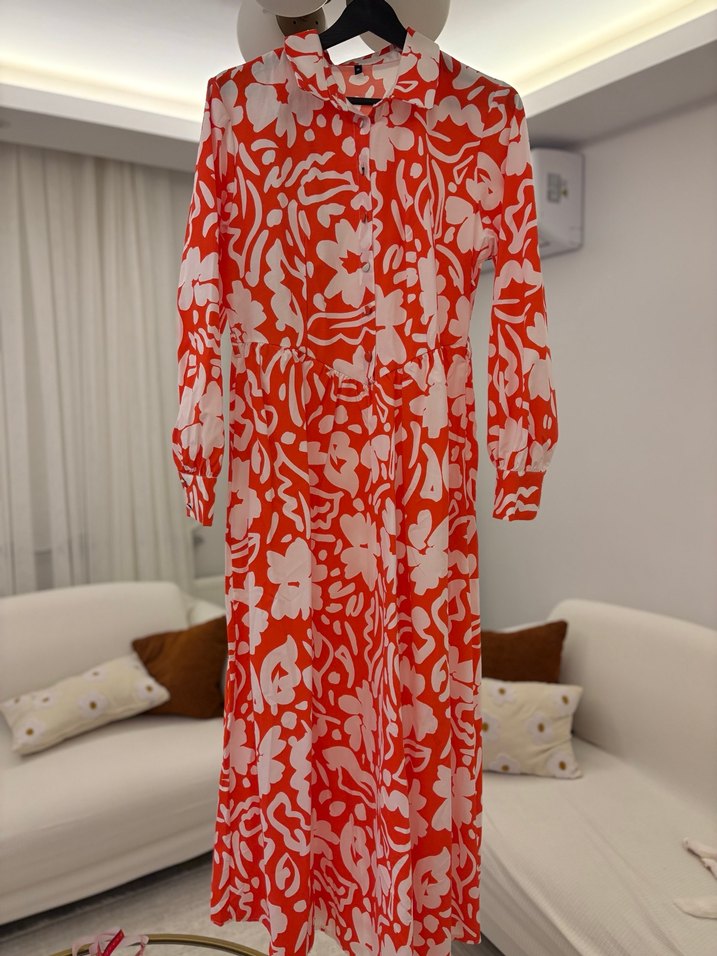 Renkli baskılı uzun kollu, yakalı bohem elbise. Yumuşak sentetik kumaştan, normal kesim ve drapeli tarzda, günlük kullanıma uygun.