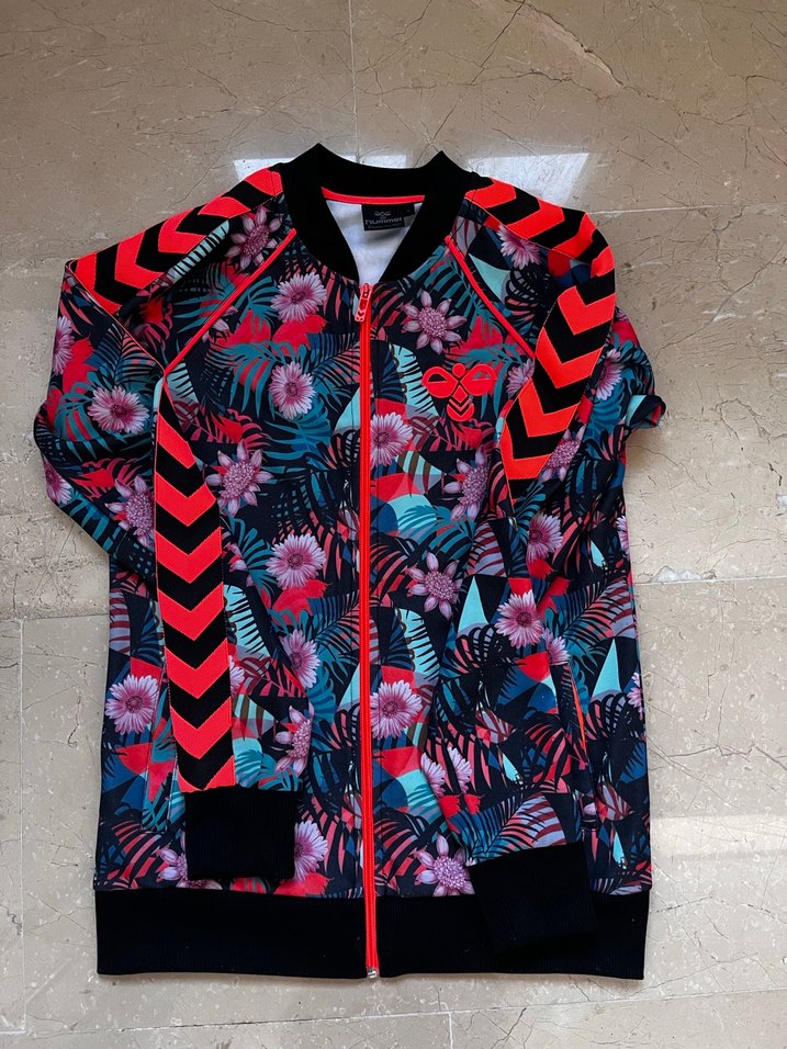 Renkli baskılı, yüksek yakalı, fermuarlı, uzun kollu, sentetik kumaştan yapılmış, dar kesim hummel hırka Günlük rahat stil için uygun.