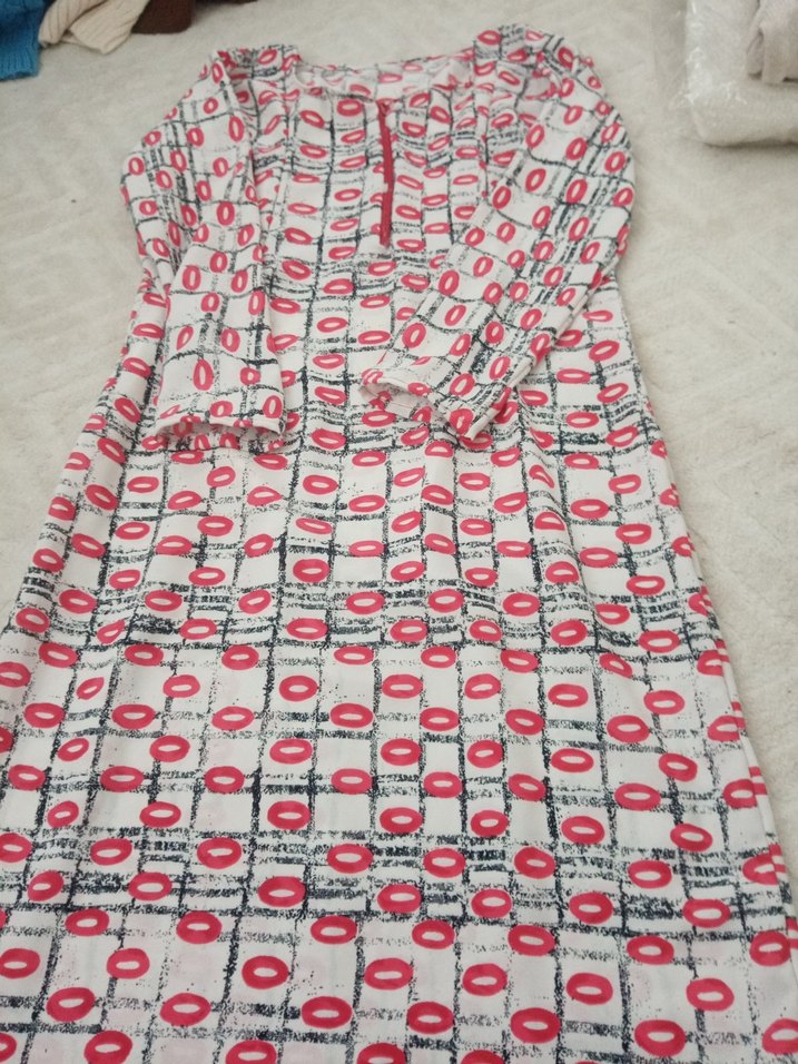 Kadın tunik uzun kollu ve bol kesim olup, yumuşak kumaş üzerine renkli baskılı desenlerle süslenmiştir. Uzun boy tasarımı rahatlık sağlar.