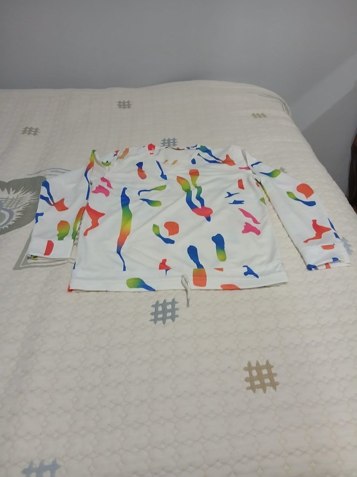 Rahat kesim, uzun kollu ve kayık yaka bluz. Renkli baskılı deseni ve yumuşak sentetik kumaşıyla günlük kullanıma uygundur.
