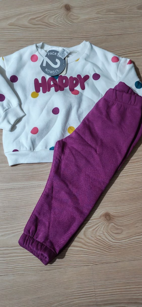 Renkli baskılı noktalı ve "HAPPY" yazılı uzun kollu örgü üst ile mor örgü pantolondan oluşan bebek kız takımı. 9-12 ay