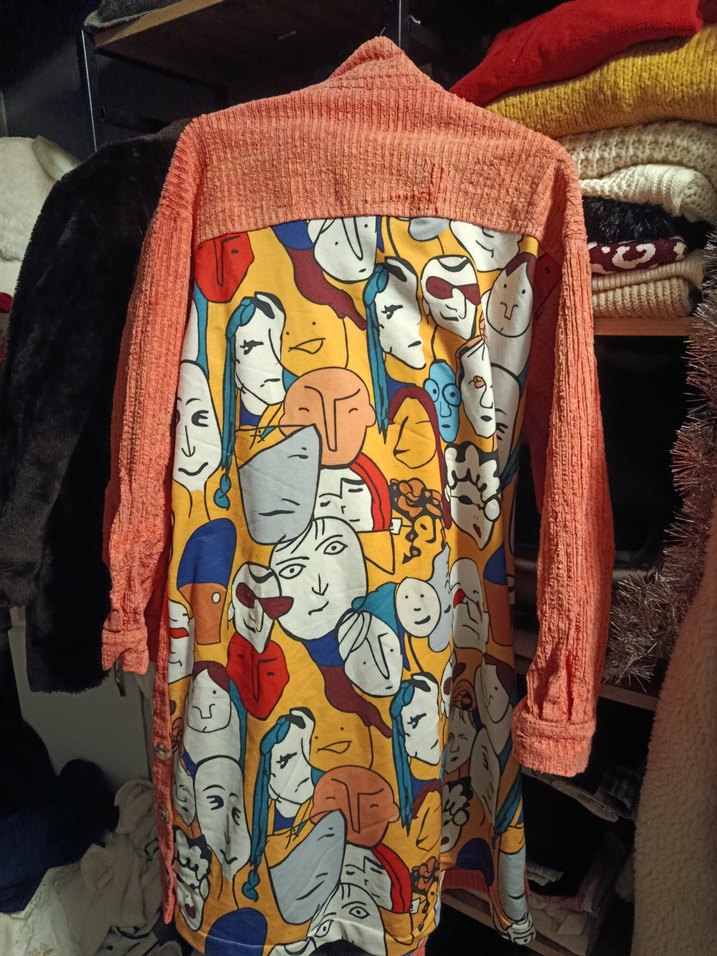 Renkli baskılı tekstil sırt ve triko uzun kollara sahip kadın tunik. Yüksek yakalı, bol kesim ve uzun boylu, bohem ve retro stil yansıtıyor. Günlük rahat kullanım için ideal.