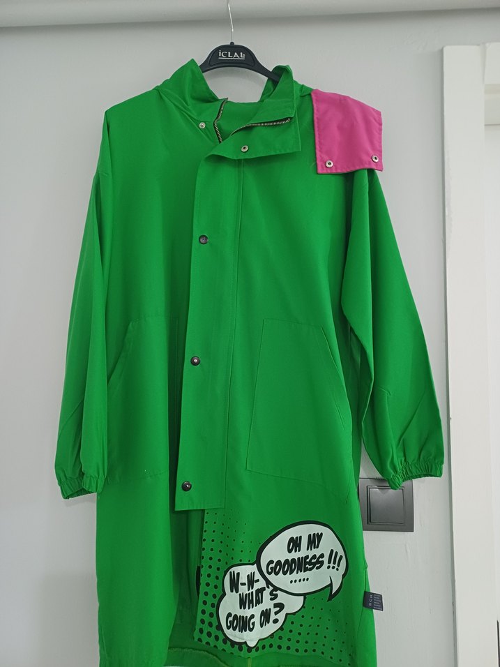 Uzun, bol kesim, düğmeli ve renkli baskılı yeşil kadın yağmurluğu. Notlu yaka, uzun kollu ve yumuşaktır. Kapişonludur.