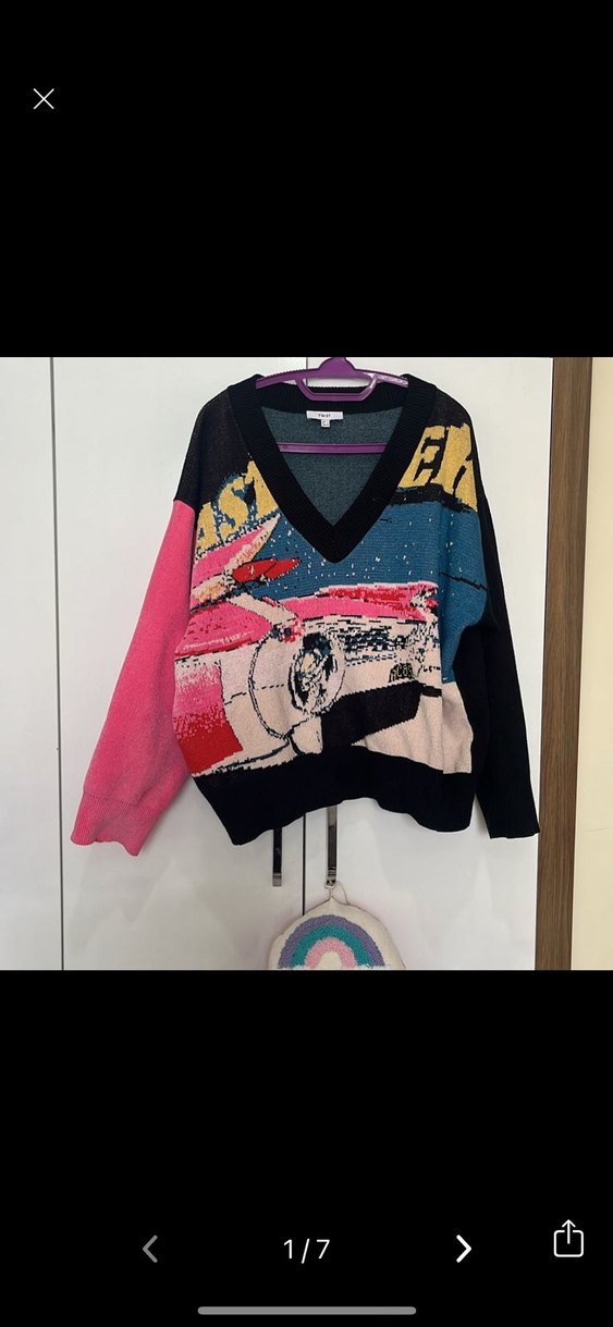 Bu kadın kazak, bol kesim, uzun kollu ve V yakalıdır. Kısa boyda ve renkli baskılı örgüdesidir, sokak stili için uygundur.