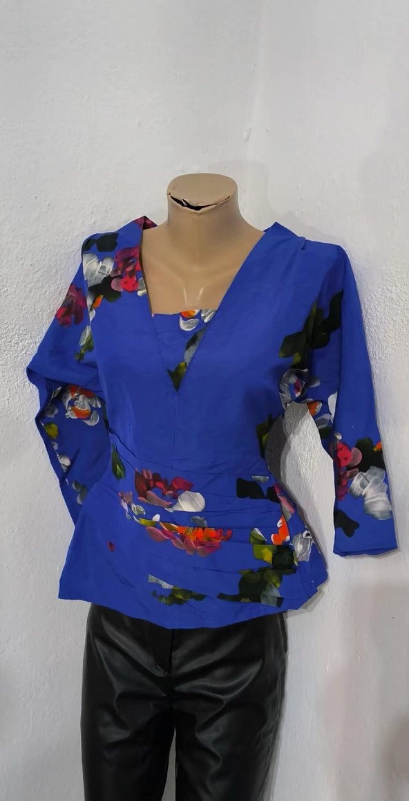 Renkli baskılı, V yaka ve uzun kollu bu bluz, bol kesim ve drapeli detaylara sahip, günlük kullanıma uygun.dikiş hataları biraz arka kısmında