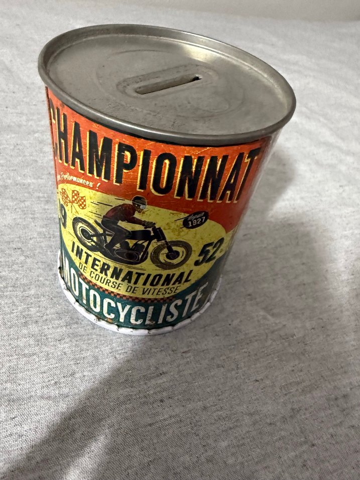 Metal kapaklı, motosiklet yarışı temalı renkli baskılı vintage seramik kumbara icinde 20 tl civarı bulunuyor