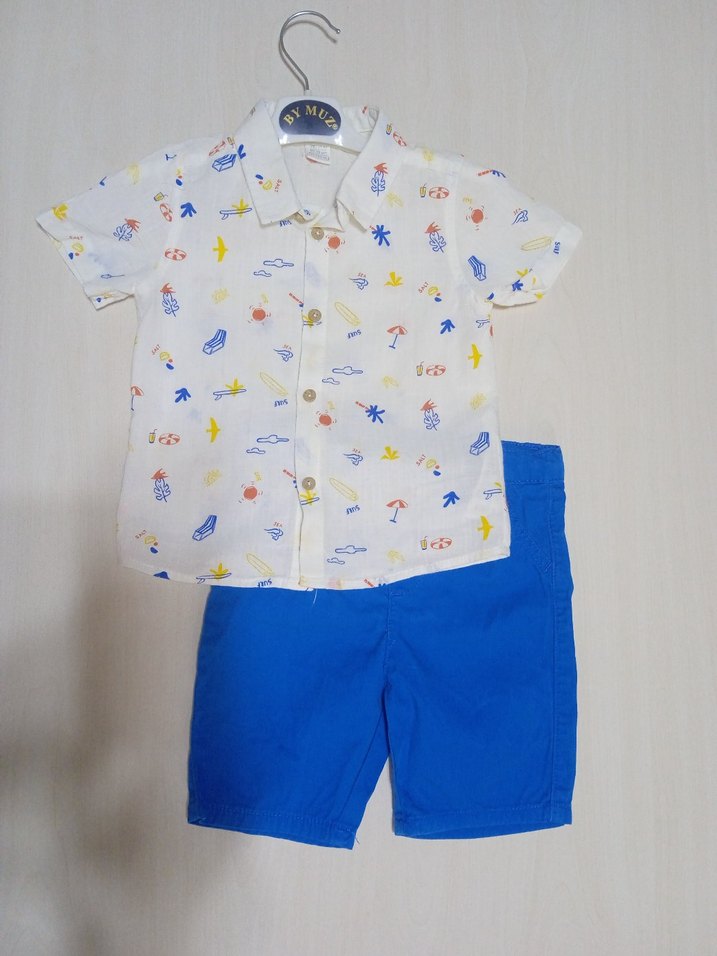 Pamuk kumaştan, renkli baskılı yaka detaylı, düğmeli kısa kollu gömlek ve canlı mavi şortlu erkek bebek takımı.