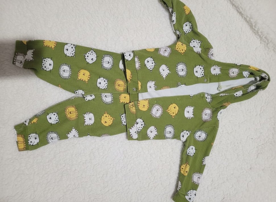 Renkli hayvan baskılı, uzun kollu ve yuvarlak yakalı, düğmeli yeşil bebek takımı, yumuşak ve sıcak kumaştan üretilmiştir. Rahat kumaş 3 6 ay arası fakat 80 cm bebeğe kadar uyumlu