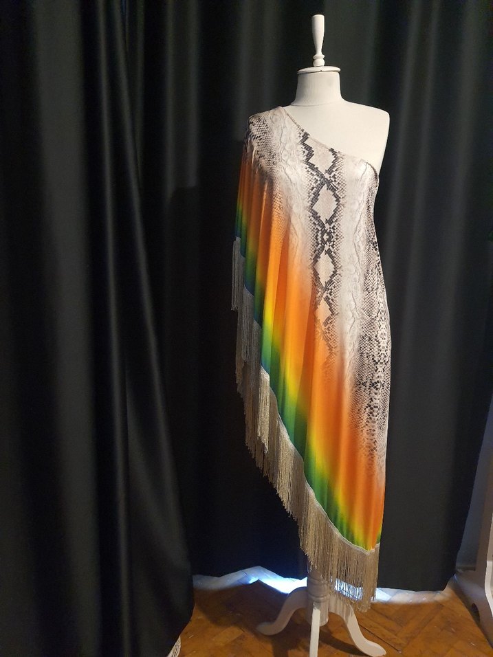 Renkli batik desenli askısız, ince ve uzun kesim. İç Astarlı, Kaygan kumaştan, salaş ve drapeli, parti için bohem tarzda tasarlanmıştır.