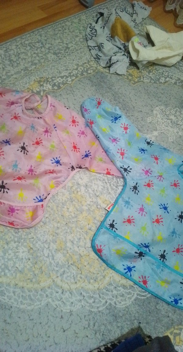Pembe ve mavi tonlarda batik desenli, renkli bebek önlükleri. Yemek sırasında kıyafet koruması sağlar. teklife alabilirsiniz
