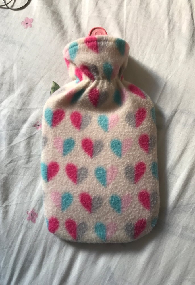 Yumuşak beyaz kumaş üzerinde renkli batik desenli bebek sıcak su torbası, sıcaklık ve konfor sağlar.