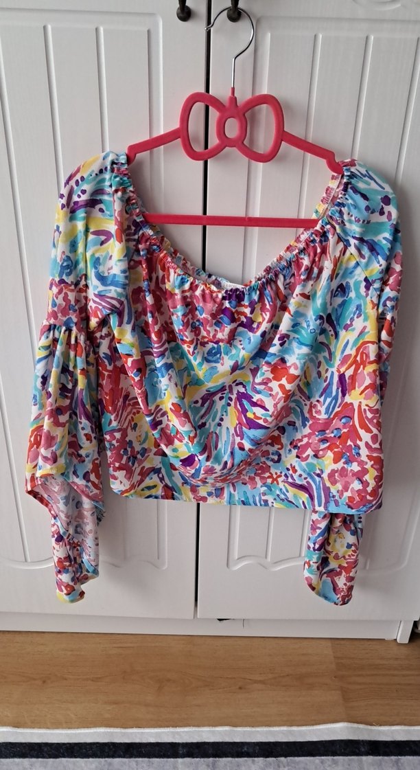 Renkli batik desenli, kayık yaka ve drapeli tasarıma sahip bohem mini bluz. Hafif sentetik kumaştan, askılı kollu ve bol kesimdir. Açık hava kullanımı için uygundur.