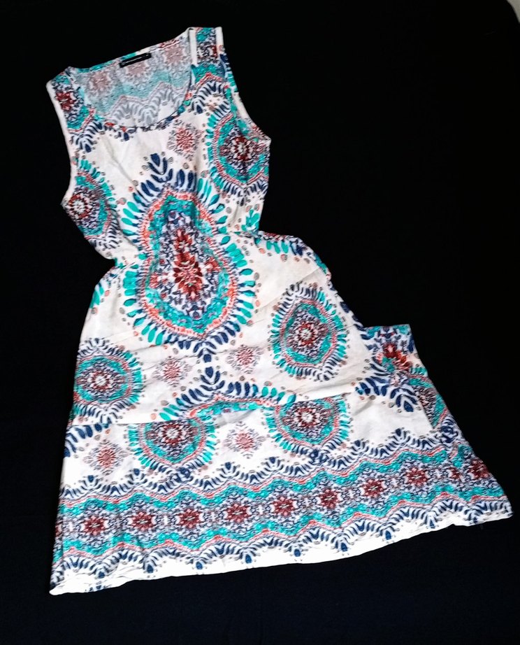 Renkli batik desenli, yuvarlak yaka ve kolsuz uzun elbise. Bohem tarzı ve vücuda oturan kesimle dikkat çeker. Kot Ceket ile güzel bir kombin yapılabilir.