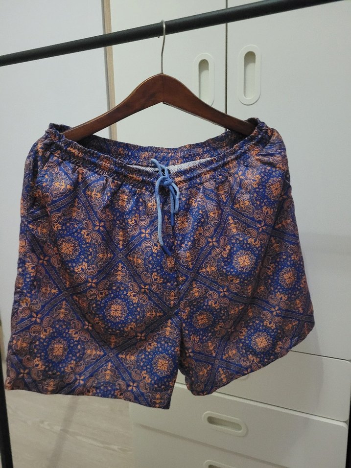 Yurtdışından.Renkli,fileli bohem bağlama desenli, bol kesim mavi deniz şortu, plaj için uygun. herhangi bir defo Sökük yırtık yoktur L XL bedene uyar.Boohoman marka