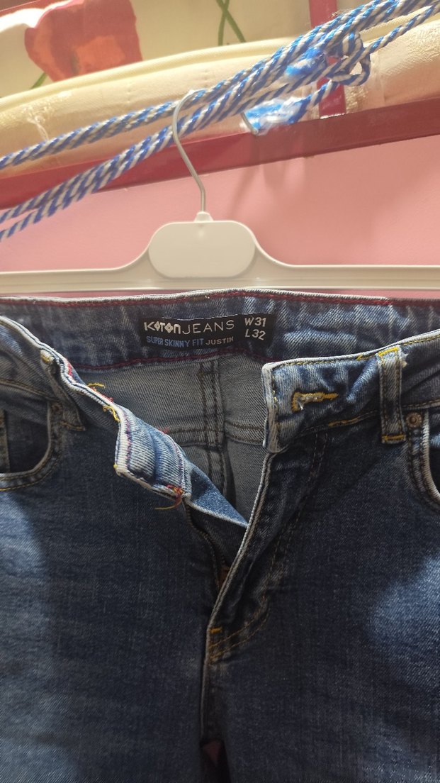 Renkli batik desenli, düğmeli, normal boy, dar kesim kadın jean pantolon. Günlük kullanım için uygun, şık ve rahat bir sokak giyimi parçası. ürün bir kere giyildi