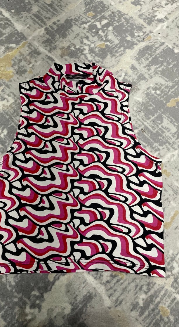 Renkli batik desenli, yüksek yakalı ve fermuarlı kadın kolsuz yelek. Fitted kesim ve midi uzunlukta, bohem ve athleisure tarzını birleştirir.