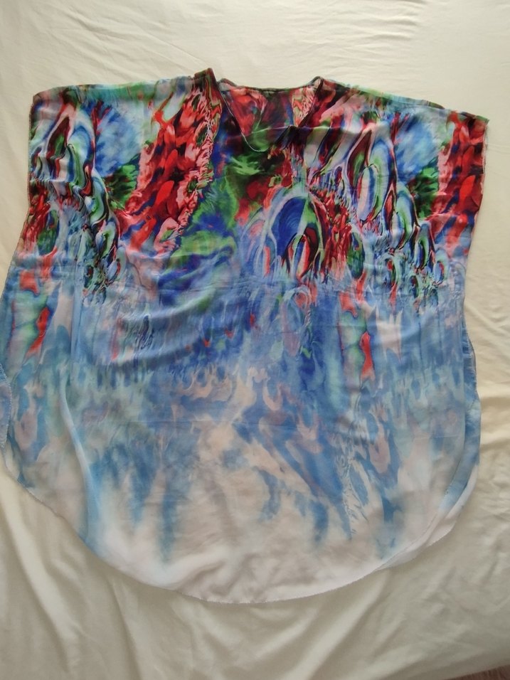 Renkli batik desenli kadın pareo bol kesim L XL uyumlu etiketi rahatsız ettiği için kesmiştim ölçüleri en 67 boy 91 cm