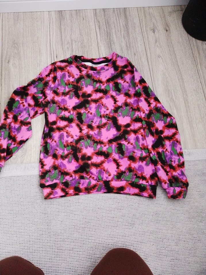 Renkli batik desenli, uzun kollu, yuvarlak yaka kadın sweatshirt. Yumuşak sentetik kumaştan, örme dokuda, rahat kesim.