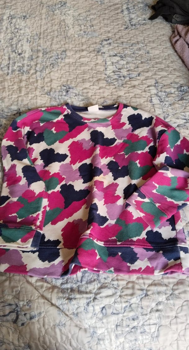 Renkli batik desenli, bol kesim ve uzun kollu kadın sweatshirtü. Yumuşak ve sıcak kumaştan, bisiklet yaka ve örme detaylarla rahat bir kullanım sunar.
