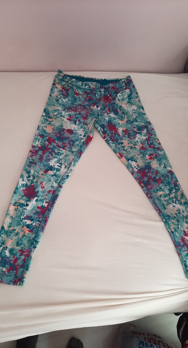 Renkli batik desenli, sentetik kumaştan yapılmış elastik bel bantlı kadın tayt. Midi boyda, dış mekan ve sokak stili için uygun.