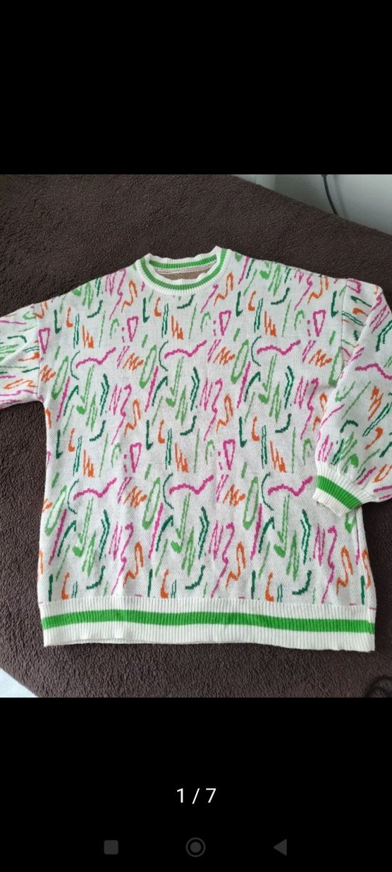 Renkli batik desenli, uzun kollu, yuvarlak yaka kadın triko kazak. Gevşek kesimiyle rahat ve retro bir sokak stili sunar.