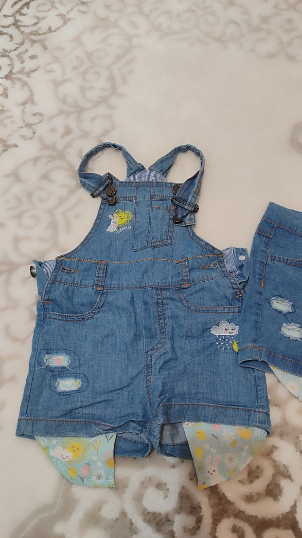 Renkli batik desenli, tokalı askılı, bol kesim mavi kot tulum. Eğlenceli patch detaylarıyla sokak modasına uygun. slopet 18 24 ay dır şort 3 4 yaş temizdir