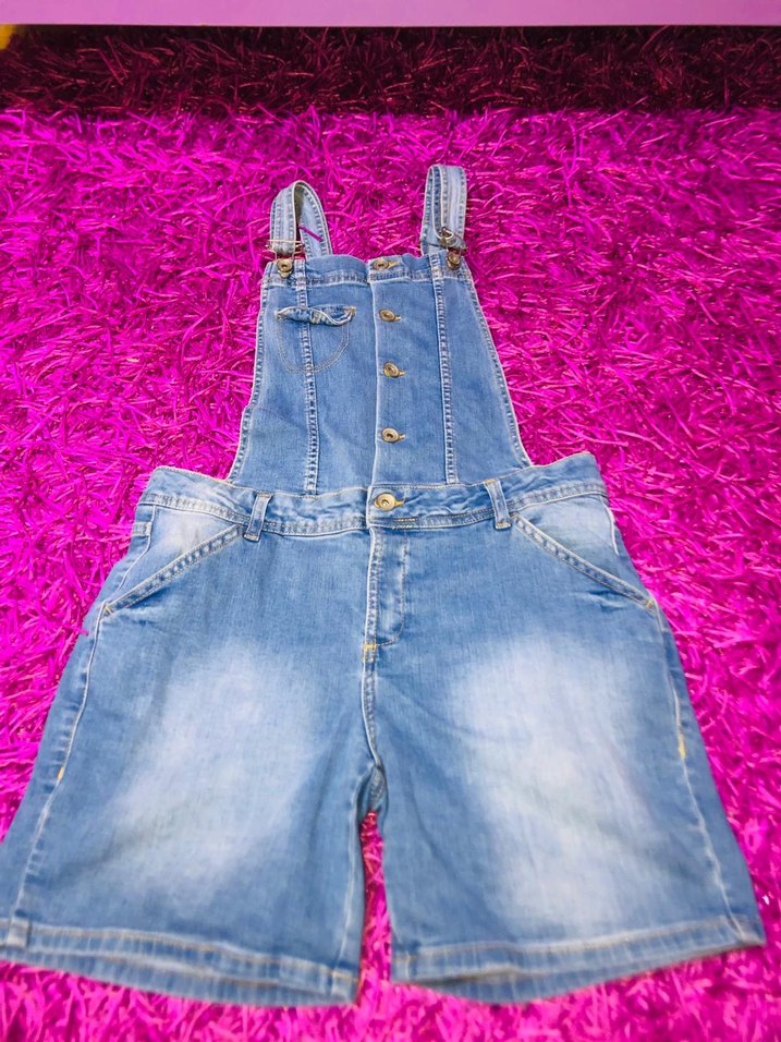 Renkli batik desenli mavi kot kız salopet, bol kesim ve askılıdır. Önü düğmeli, sokak stili için uygundur.