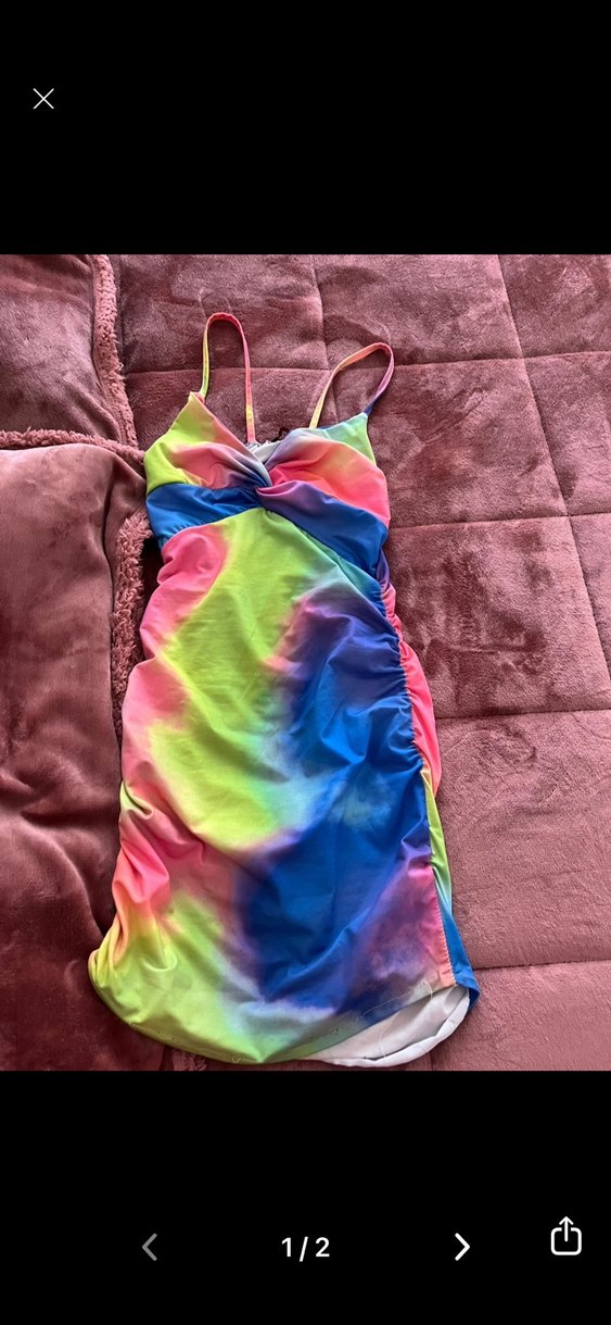 Pastel renklerde batik desenli, drapeli ve askılı kısa elbise. Yumuşak sentetik kumaştan, bohem ve retro tarzda, parti için uygun.