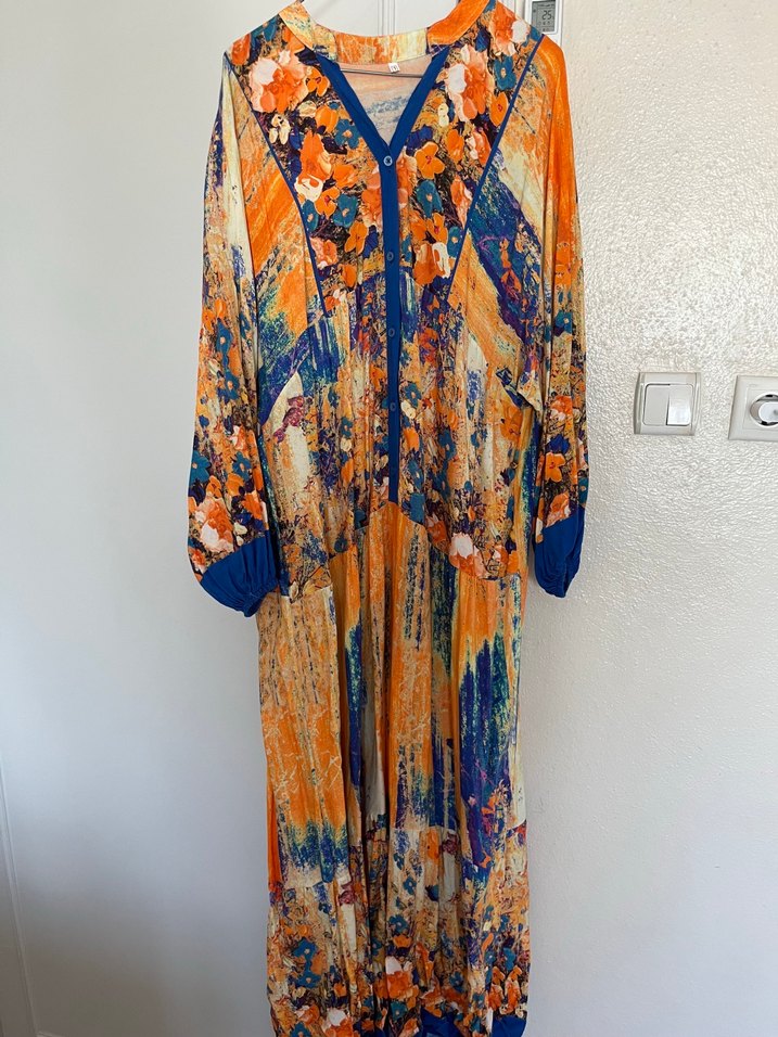 Kadınlar için renkli batik desenli, pileli detaylı uzun kol ve bol kesim yüksek yakalı bohem elbise. Hiçbir kusuru yoktur