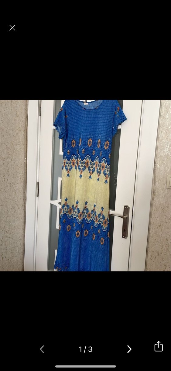 Renkli batik desenli, pileli tekstil kumaştan uzun ve bol kesim bohem elbise. Kısa kollu ve tekne yaka, günlük kullanıma uygun.