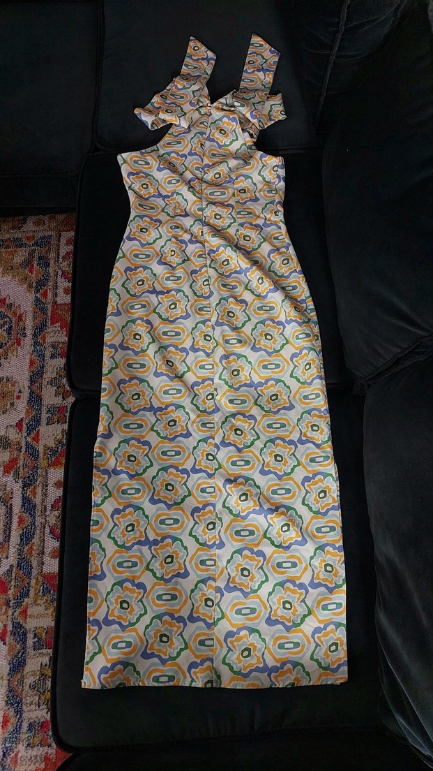 Renkli batik desenli, kolsuz ve tekne yaka uzun bohem elbise, sentetik kumaştan drapeli kesime sahiptir. L beden giyen kişi 62kilo 1.80boy