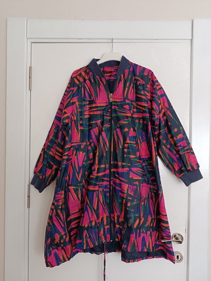 Renkli batik desenli uzun ceketi, bol kesim ve yüksek yakalıdır. Fermuarlı önü ve sokak tarzı görünümüyle günlük kullanıma uygundur.