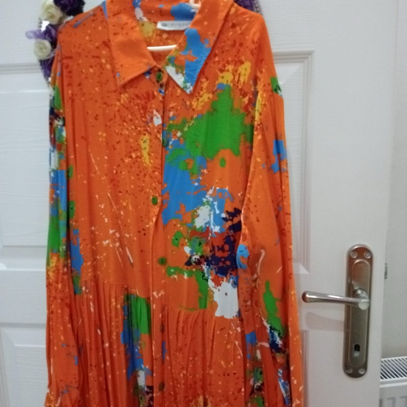 Renkli batik desenli, düğmeli ve yakalı uzun kadın elbisesi, bol kesim ve sentetik kumaştan yapılmıştır. Bohem tarzına uygundur. 44/52 beden olur