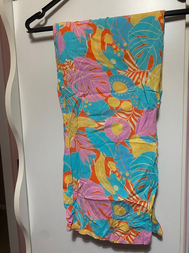Renkli batik desenli, sentetik kumaştan yapılmış, drapeli ve uzun kız çocuk pantolonu. Bohem tarzı ve plaj için uygun.ürün kızım beğenmediği için hiç kullanılmadı