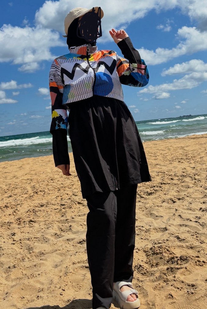 Renkli batik desenli, uzun kollu ve bol kesim kadın haşema ,plajda şık ve rahat bir görünüm sunar. Bir defa giyildi.