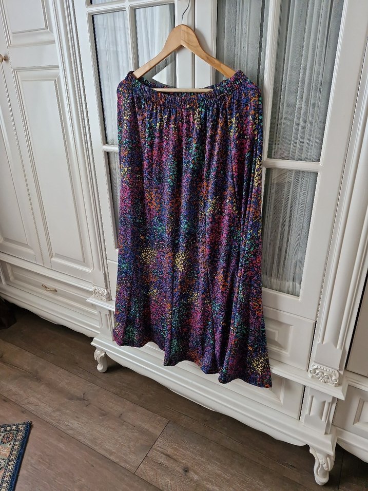Renkli batik desenli bu uzun etek, salaş kesim 42/44bedene uygun..boy..94 cm..beli lastikli iç göstermez kumas..Yeni hiç kullanilmadi